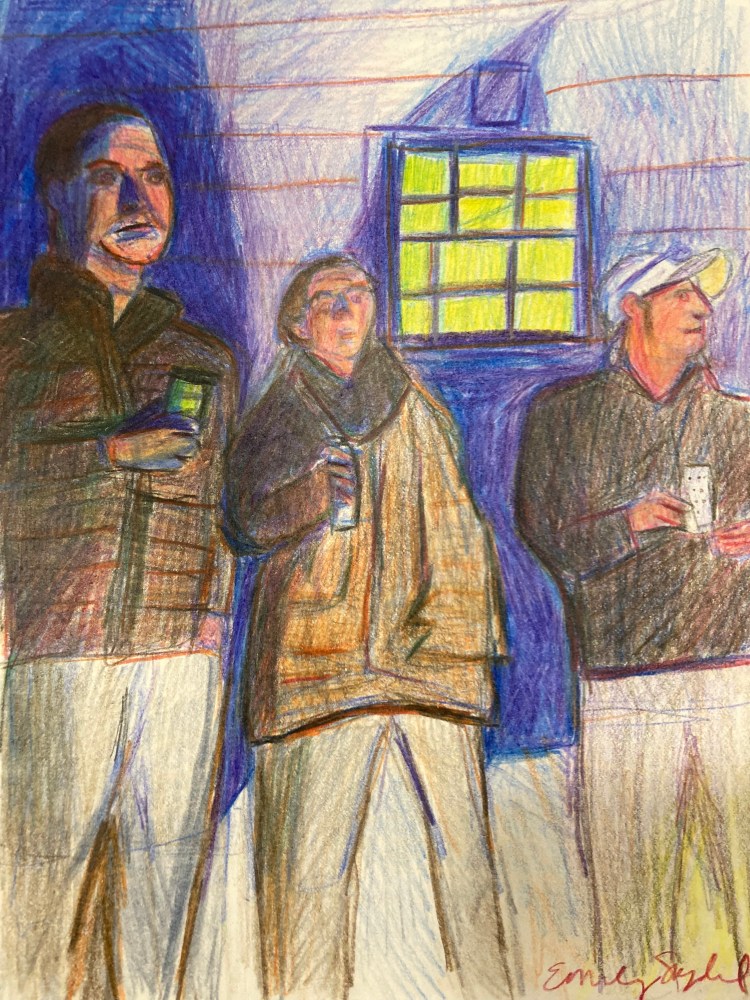 friends cast in fire light (2021) Friends at the Fire Pit, 6.5×9 in. , colored pencil on paper Jonah in New Ro, 6.5×9 in., colored pencil on paper Friends at the Firepit #2, 6.5×9 in., colored pencil on paper Friends at the Firepit #3, 6.5x9in., colored pencil on paper